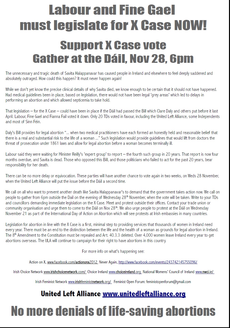 Labour and Fine Gael Must Legislate for the X Case – Gather at the Dáil on November 28, 6pm