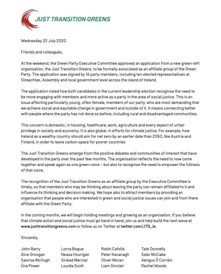 McHugh signed a “Just Transition Greens” (JTG) statement which did not address a key question : rejection of coalition with Fianna Fáil and Fine Gael – actively opposing the current FFFGGG government. Active Opposition to the Maradkar-Ryan coalition is the accelerating direction of travel. Saoirse McHugh signed the the JTG statement, and has left the Green party. She directly calls on the JTG to break off from the Ryan-Greens and form “an actual eco-Socialist party”.
