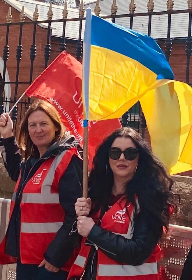 UNITE Trade Union members Rhona McCord and Mandy LaCombre protest against Putin’s Invasion of Ukraine at the Embassy of Russia, Orwell Road, Dublin 6.
