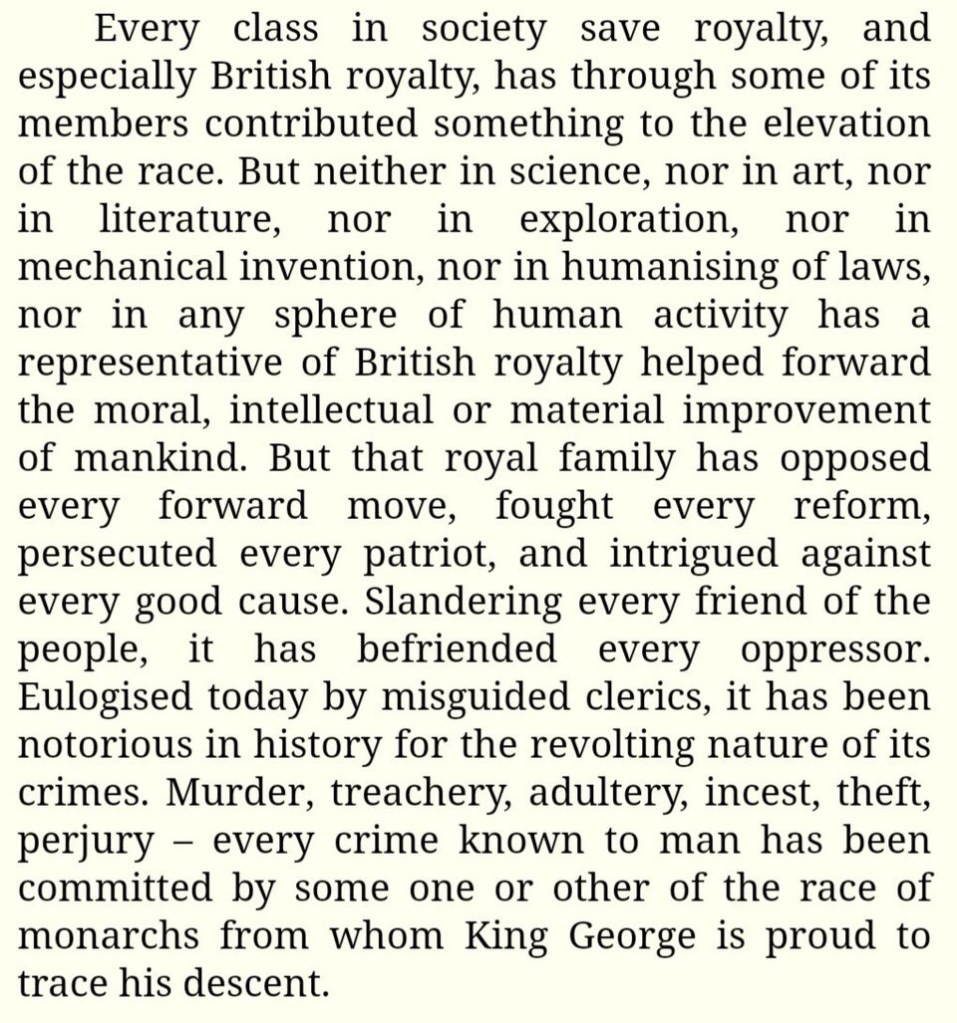 Some of the mourning whiteys are Irish – gushing, just like the Irish President, about the English queen’s “unique place in Irish history”. The 1916 Easter Rising leader James Connolly had better words :