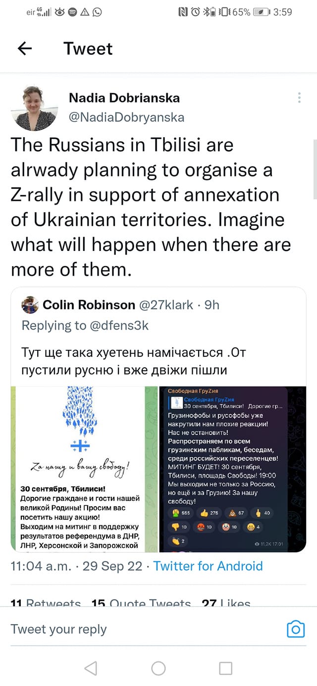 Two tweets referring to Russian refugees from Nadia Dobrianska were also posted on ‘Left Links’ (29th September). If these tweets are genuine they – or one in particular – are problematic for her and for a speaker at a left public meeting on Ukraine. These will be discussed later but for now it should be noted that they do not offer evidence that she is fascist, or far right or even has an anti-immigrant position in general.