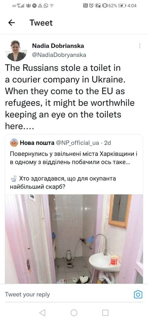 As mentioned already they do not offer evidence that she is fascist, or far right or even has an anti-immigrant position in general. But in their attitudes to Russian refugees, and by implication to Russian draft dodgers and Russians in general they are objectionable and politically illiterate, especially for a highly-qualified human rights worker. Yet there is mitigation – not forgiveness – in so far as they apply to Russians only. Following the brutal and murderous invasion of their homes and lives by Russia, displacing millions of Ukrainians, and the pacific and even patriotic greeting of the invasion by most Russian (who of course could neither know the facts nor do much about them in the crushed circumstances of the Russian state), it would be expected – and you can bet it is the case across most of Ukraine – that many Ukrainians would wrongly blame and hate all or most Russians. There can be no shock or mystery about this to an Irish political activist of any experience of the Troubles in the North, where the atrocities of the RUC, the British army and loyalists engendered a hatred among some Catholics of all ‘Brits’ and even Protestants.
