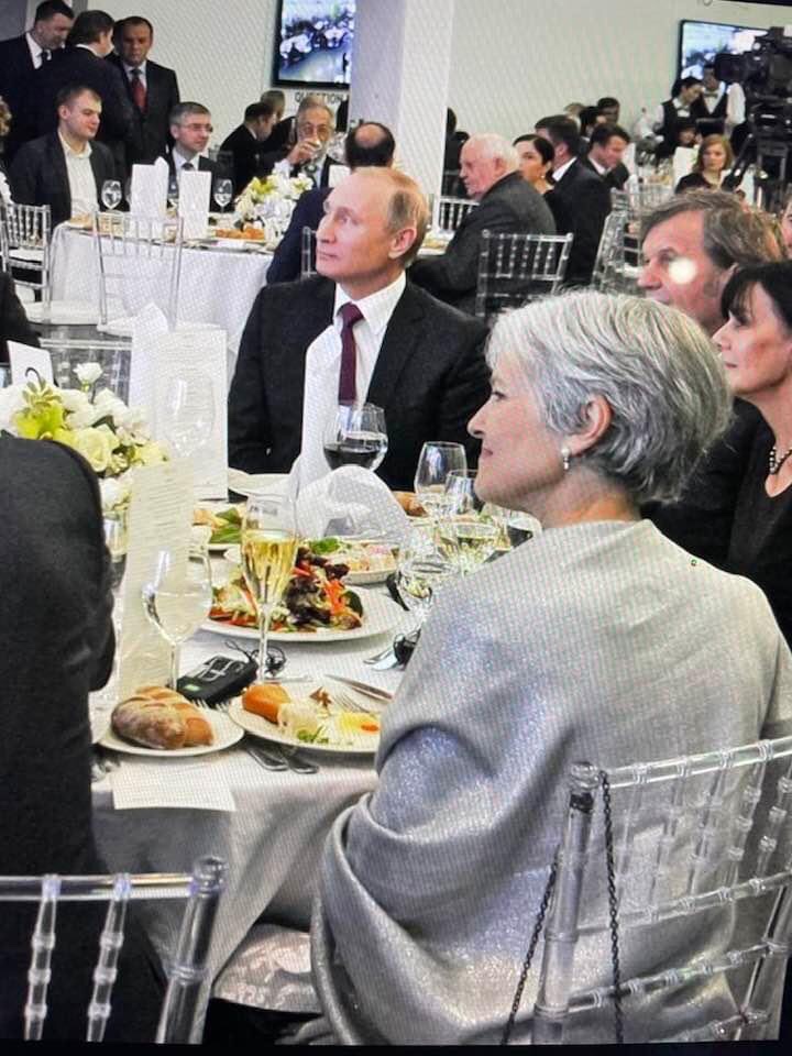 Stein is photographed here on December 15, 2015 at a banquet in Moscow honoring Russian propaganda media RT, wholly owned by the Kremlin, for ten years of operation. Her table mates include Putin & several of his advisors. Apparently she has no problem with Russian disinformation since RT has been one of the chief media sources promoting Assad’s counterrevolution against the Syrian Arab Spring & defending Russian bombing in Syria which began in September 2015.