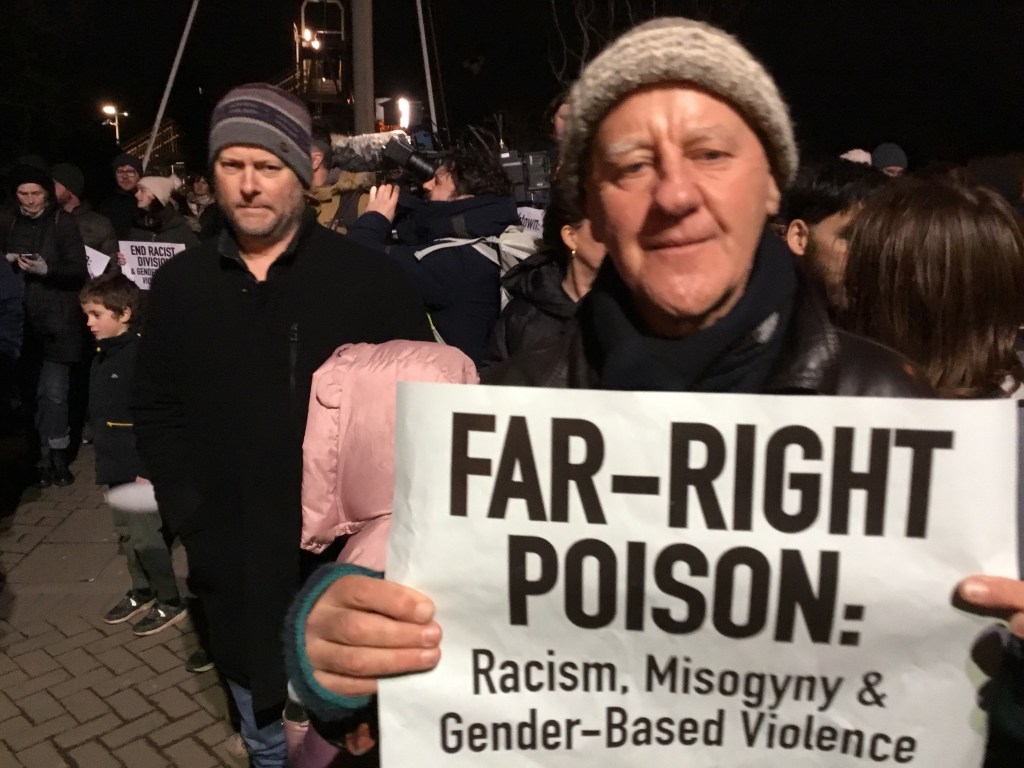 Up to 200 protesters attended an anti-racist protest in Ashtown (Dublin 15) on a freezing cold night – an impressive turnout to a demonstration called at short notice after news of a brutal racist attack was widely circulated two days beforehand. Journalists from various mainstream media organisations attended.