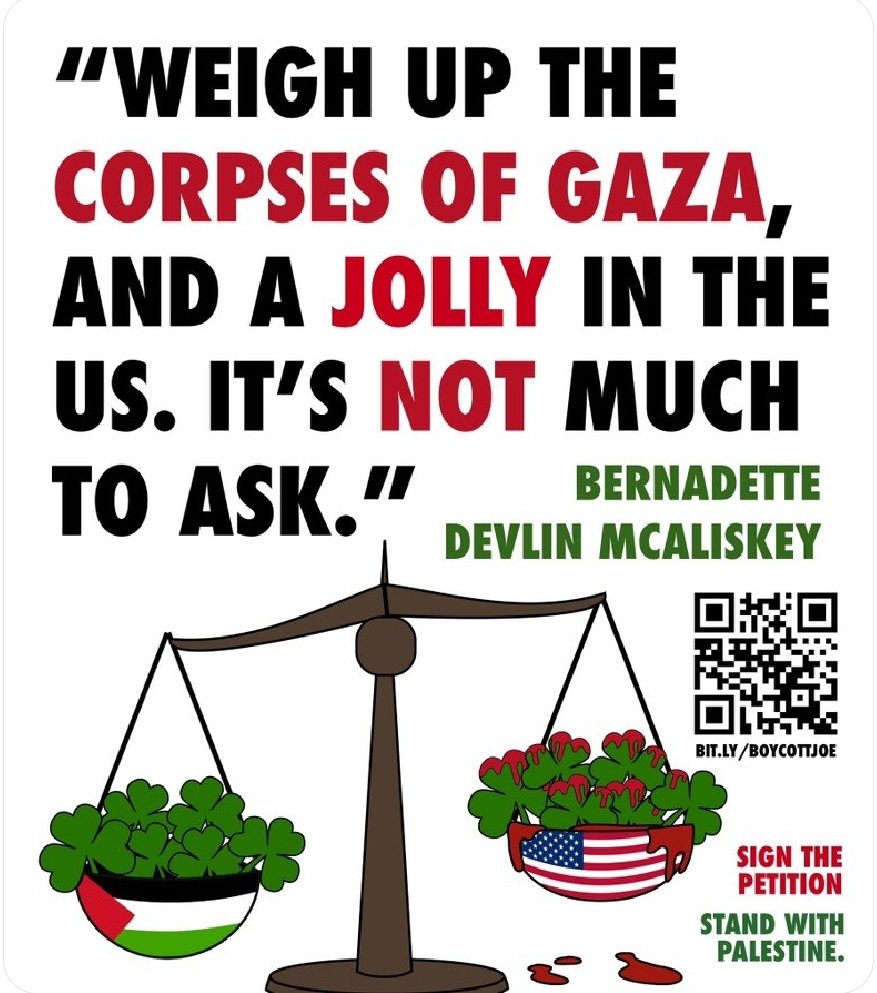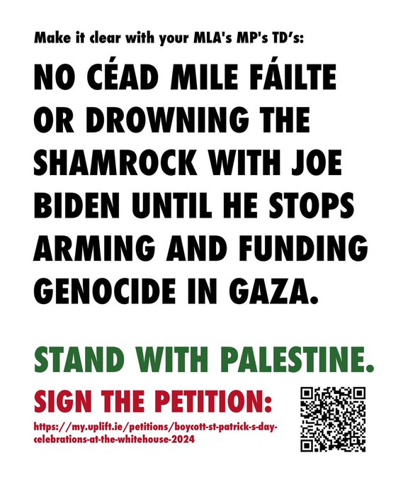 As a lifelong Sinn Féin voter, I’m appalled at the leadership’s decision to go to Washington for Paddy’s Day. I’m going to take my lead from my Palestinian friends in Ireland on this one who are adamant they don’t want any Irish leader to darken Genocide Joe’s door. If the US were providing the weaponry to massacre my people, we’d want our Palestinian allies to stand by our side, not theirs. Solidarity without substance is just gesture politics. It’s never too late to do the right thing