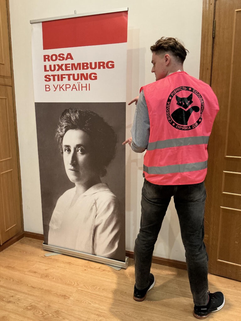 Pavlo Bryzhatyy is pointing at the Rosa Luxemburg Stiftung office banner and wearing the vest with logo of Priama Dija (Direct Action), the network of independent leftist student trade unions in Ukraine in which Pavlo is active. Founded in 2008, it has played a significant role in progressive movements in Ukraine. Its basic goal is to build student organization from below to advocate for free public education, better student stipends, better student facilities on campus, and against the commercialization and privatization of education.