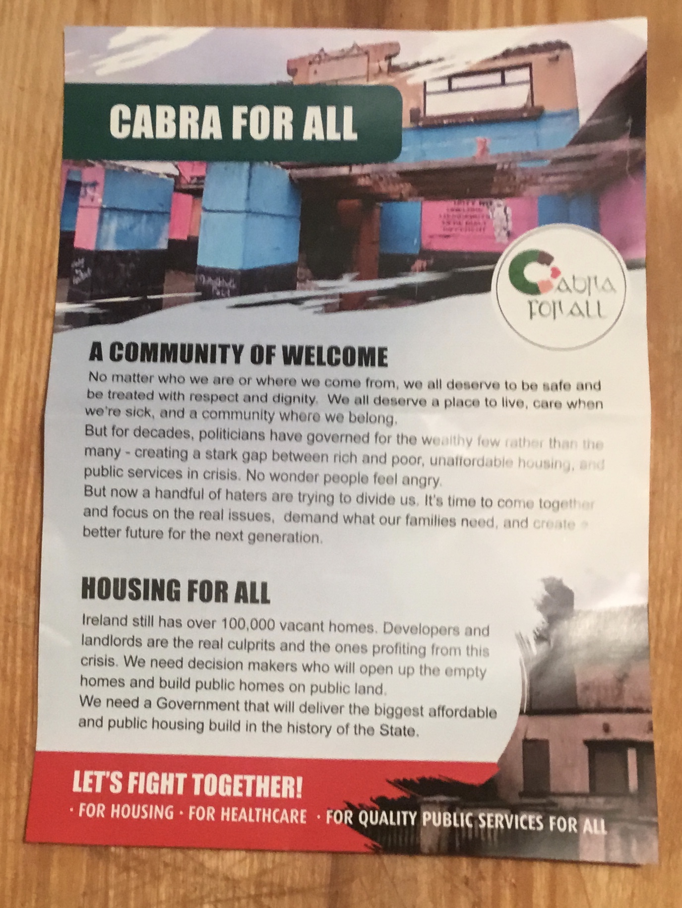 Cabra For All is distributing this leaflet as widely as possible in the Dublin Central Constituency