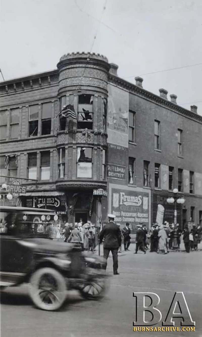 A “fiery cross” made from red light bulbs shined in the office’s third-floor window. By a stroke of luck, a store selling groceries on the ground floor had barrels of potatoes outside. The students began launching the potatoes, breaking the window and then all of the lights but the top one. Their arms ragged, no one seemed to be able to reach the last taunting bulb.