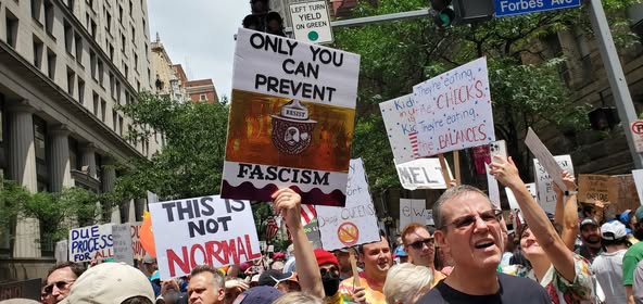 The “No Kings” demonstrations were part of a wave of demonstrations that have developed over the past few months. The first big one was the April 5 demonstration, under the slogan of “Hands Off.” Hands Off the health care system, education system, various other things that are being dismantled or attacked by the Trump regime. In Pittsburgh, there was a massive demonstration. It was the largest that I had seen in the city up to that time, 8000 people minimum.