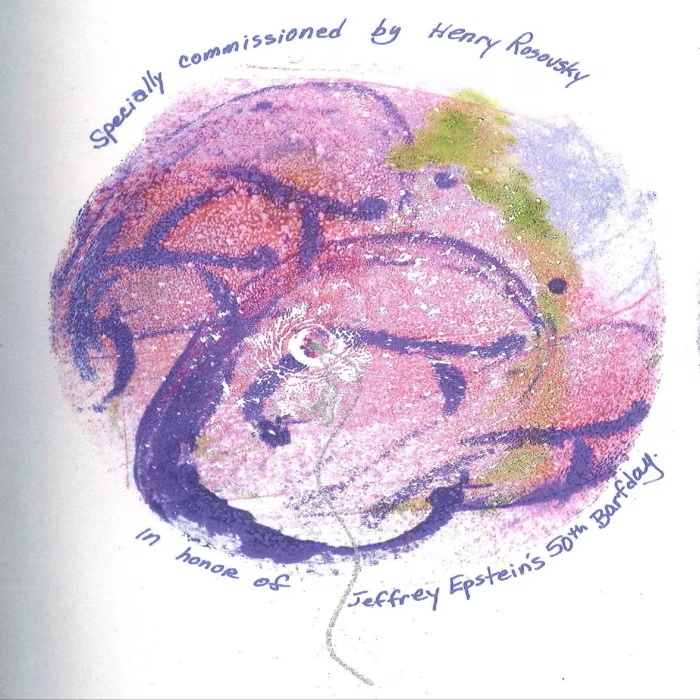 Henry Rosovsky, one of several current or former Harvard University professors in the book, included a “tit print” that he “specially commissioned” for Epstein. A friend called Nick included photographs he said he took of wild animals having sex, adding that the pictures “seemed more appropriate than anything I could put in words”. One hand-coloured drawing contains an inset of Epstein greeting three girls, one holding balloons, in 1983 — seven years after he ended his career as a private schoolteacher. The surrounding picture shows a nude Epstein on a sunbed, being massaged by four different women, one of whom has “JE” in a heart shape on her right buttock. There are multiple other references to the massages that both Epstein and Maxwell are now widely known to have recruited girls and women to provide.