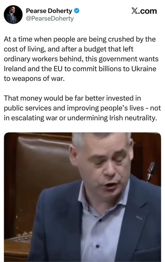 Now Pearse Doherty shows what Sinn Féin really represents today. According to his statement in the Dáil: https://www.thejournal.ie/eu-loan-to-ukraine-pearse…/, he wants to cut funding to Ukraine — even as 600,000 households in Kyiv remain without electricity in -20°C temperatures. He complains that EU funds are used for military purposes — but what else should they be used for when a neighboring country is bombing homes, schools, hospitals, and critical infrastructure?