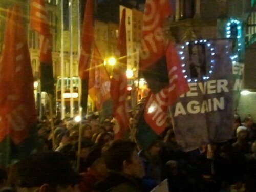 Trade Union Flags mingle with “Never Again” images of Savita Halappanavar on a bitterly cold evening at Dublin City Hall.