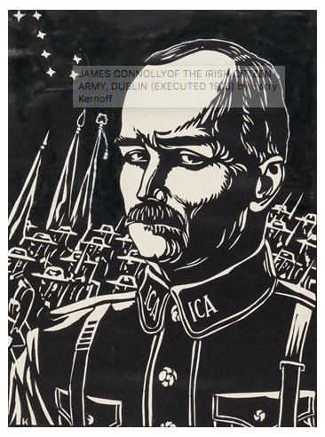 Harry Kernoff’s woodcut of James Connolly in the uniform of the Irish Citizen Army, whose flag is on the banner of the ILWU.