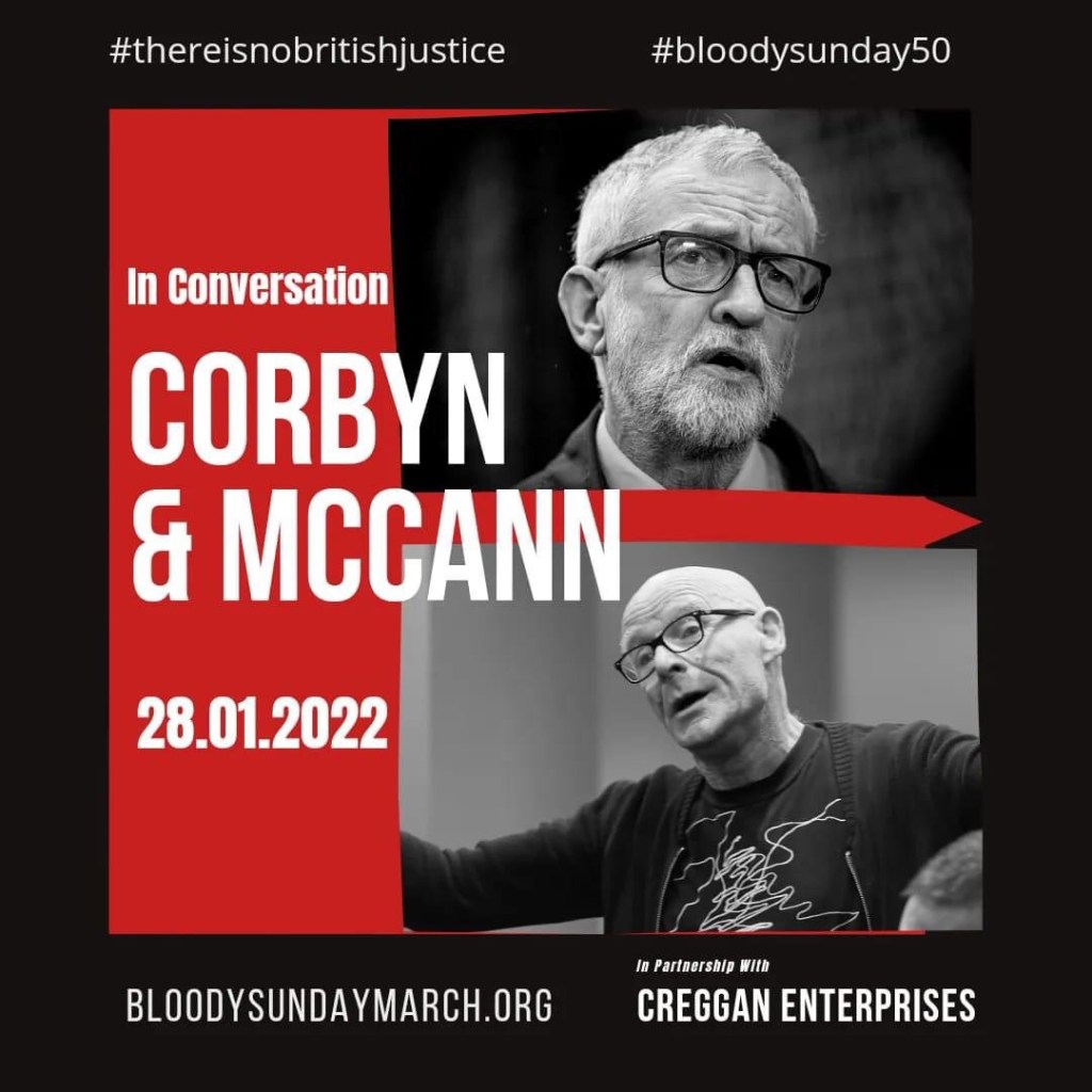 We are honoured to announce that we will co-host, in partnership with Creggan Enterprises, former British Labour Party leader Jeremy Corbyn in conversation with journalist and long time campaigner for Justice for Bloody Sunday, Eamonn McCann. Broad topics for the conversation will be civil rights, legacy and social justice.The event will take place at the Hive Studios at the Ráth Mór Centre in Creggan, on Friday, January 28th January 2022. Start Time 14.00 Eamonn McCann is a longstanding member of the Bloody Sunday March Committee.