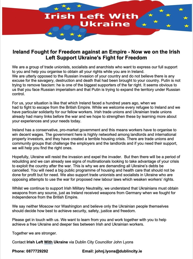 Irish neutrality is perfectly compatible with demanding that Russia withdraw from Ukraine immediately and stop its barbarous assaults on civilians and civilian infrastructure, with support for the right of Ukraine to arm and defend itself, with support and solidarity for the Ukrainian people and labour movement, and with backing for self-determination for Ukraine.