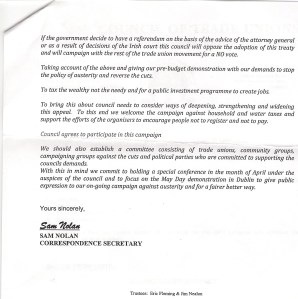 It calls for a united campaign against austerity, for the trade unions and the ICTU to oppose the Treaty and for support for the household and water charges non-payment campaign.